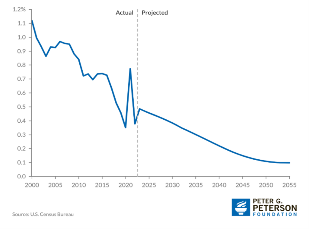Percentage bevolkingsgroei – vastgesteld (actual) en verwacht (projected)